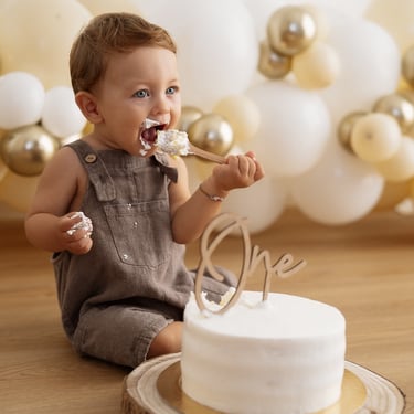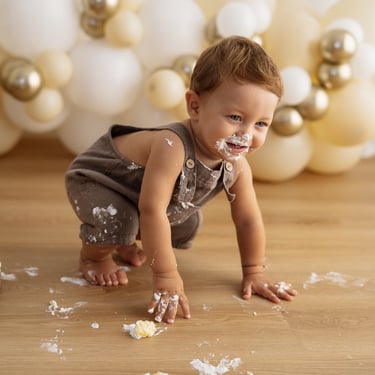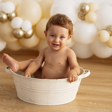 Un servizio fotografico per festeggiare un importante traguardo, il primo compleanno, con alcune foto di famiglia e le foto assaggiando o distruggendo una torta squisita, terminando con un bagnetto schizzando acqua ovunque.